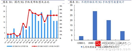 2020年11月之前,国内5G手机的快速渗透,与国产安卓品牌厂商密集发布5G新机、以及将5G手机价格快速推低息息相关:(1)工信部数据显示,虽然今年上半年国内受疫情影响,但从二月开始,每月发布的新5G机型数量占智能手机机型数量的占比基本超过60%;(2)而据我们统计整理,截止2020年6月4日,在各个品牌厂商官网在售的5G手机中,价格低于2000元的机型数量占比已超过5%,2000-4000元的机型占比接近50%,4000-6000元机型占比在30%左右,超过6000元机型的占比约15%。当前,更低的5G手机价格已在1600元以内。