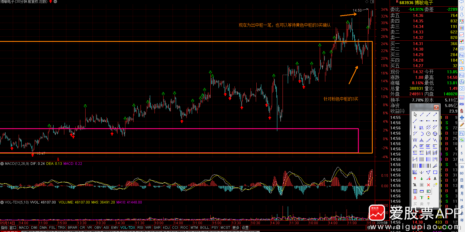 我们可以看到现在针对粉色中枢出了3买,但是橙色中枢还没有3买,那么我们可以继续等橙色中枢的3买确认,因这里即将要到压力,所以等3买是不错的选择,3买出来当机会,止损为3买破坏点。