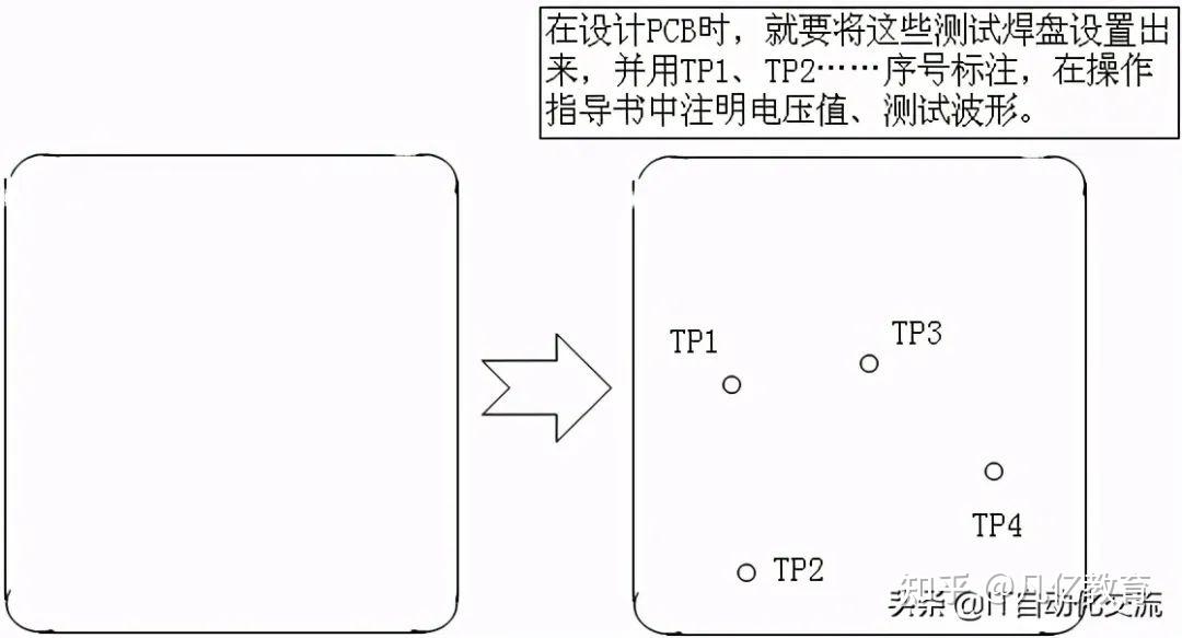 在设计PCB时,就要将这些测试焊盘设置出来,并用TP1、TP2……序号标注,在操作指导书中注明电压值、测试波形。