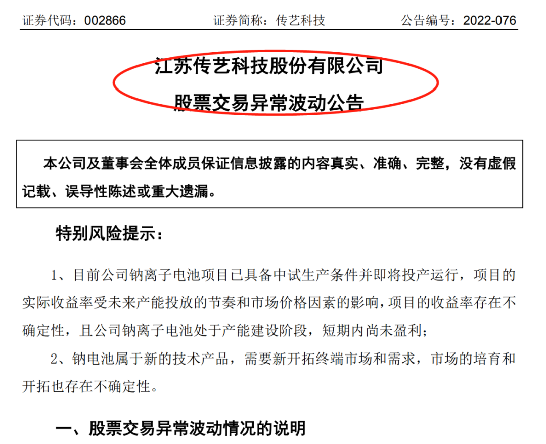 当日晚间,公司发布股价异动公告,特别提示了钠离子电池项目风险,表示项目虽已具备中试生产条件并即将投产运行,但实际收益受未来产能投放的节奏和市场价格因素的影响,存在不确定性,且公司钠离子电池处于产能建设阶段,短期内尚未盈利。与此同时,钠电池属于新的技术产品,需要新开拓终端市场和需求,市场的培育和开拓也存在不确定性。