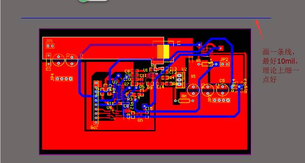 如图所示的双面PCB板,首先要在上方画一条线(更好10mil)