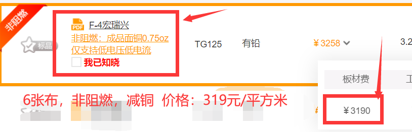 ②6张布、非阻燃且减铜的板材,价格为319元/平方米,10平米板材总价为3190元。截图如下: